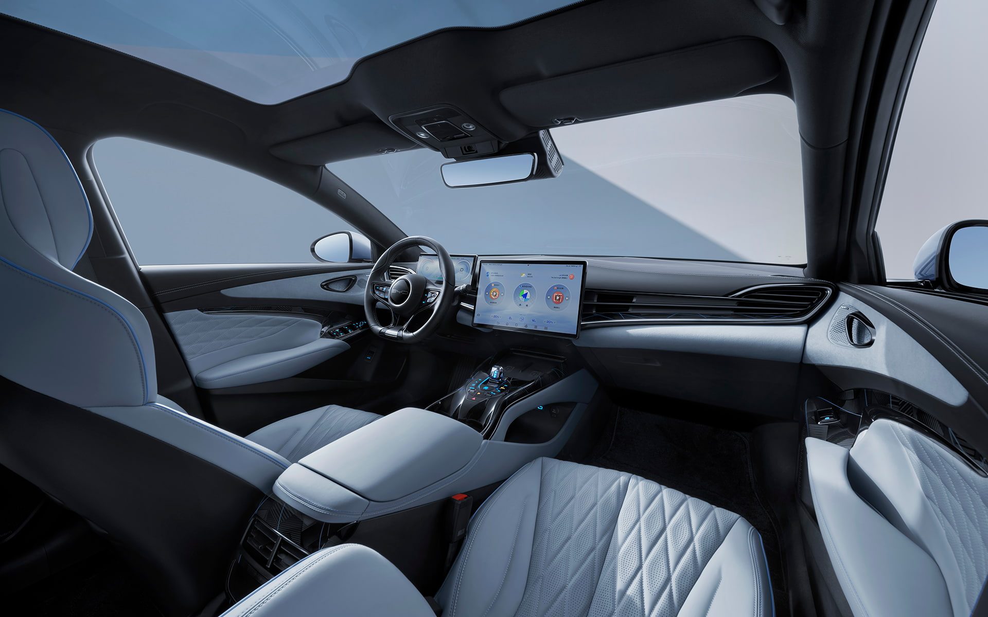 Không gian thoáng đãng nhờ động cơ điện và hệ thống pin tinh giản đặt dưới sàn xe, đảm bảo sự thoải mái cho hành khách trên xe.